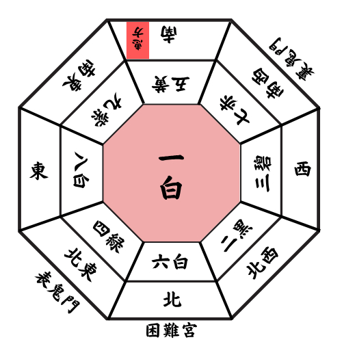 本命星が中央に位置し、八方をすべて塞がれ、どの方角に事を起こしてもうまくいかない八方塞がりの年回りです。